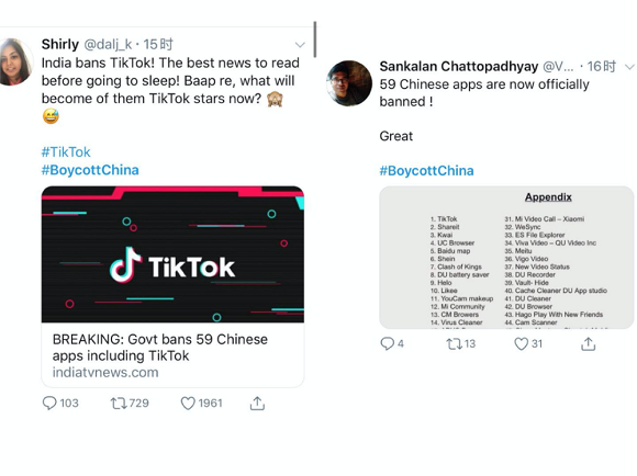 印度禁用59款中國App一事也在6億多印度網(wǎng)民中,也引發(fā)了激烈的討論。相關話題 “BoycottChina(抵制中國)”、“ChineseAppsBlocked(中國應用被禁)”,一度沖上了社交媒體熱度榜前列。