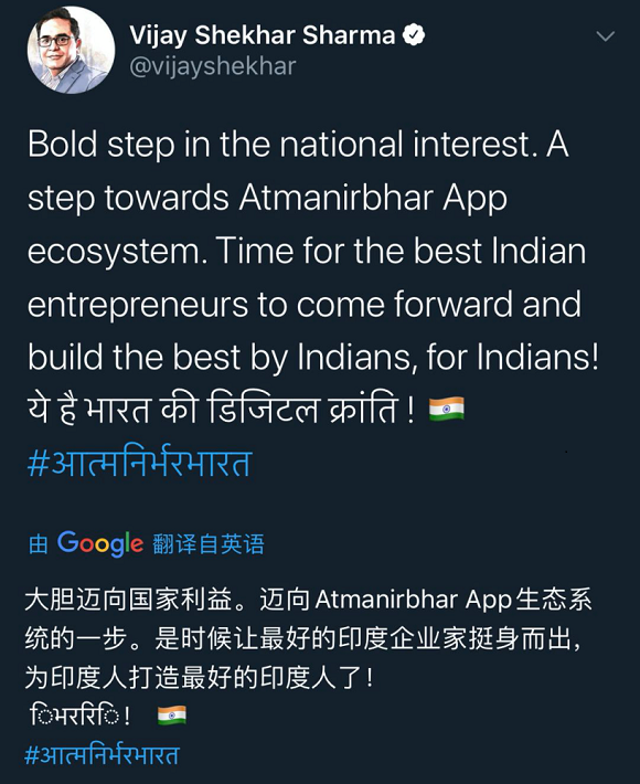 “這是為了國家利益邁出的大膽一步,距離建立印度自身的互聯(lián)網(wǎng)生態(tài)體系又近了一步。印度本土的企業(yè)家,是你們?yōu)榱藝液腿嗣窠ㄔO印度互聯(lián)網(wǎng)世界的時候了!”