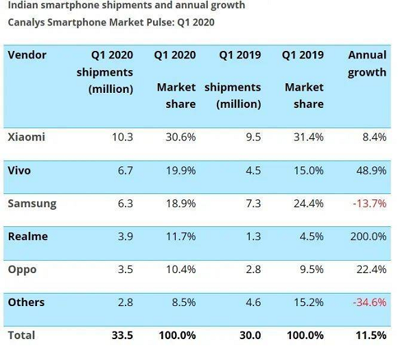 印度智能手機市場中,排名前五的分別為小米、Vivo、三星、Realme,和Oppo