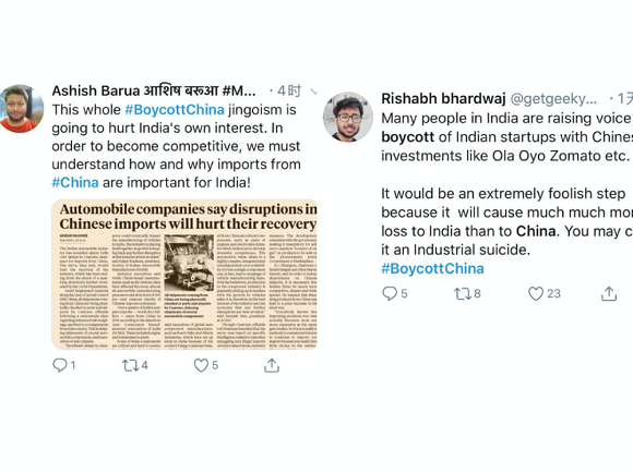 印度禁用59款中國App一事也在6億多印度網(wǎng)民中,也引發(fā)了激烈的討論。相關(guān)話題 “BoycottChina(抵制中國)”、“ChineseAppsBlocked(中國應(yīng)用被禁)”,一度沖上了社交媒體熱度榜前列。