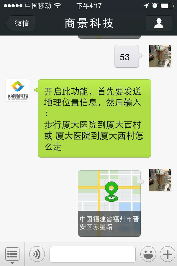 開啟此功能,首先要發(fā)送地理位置信息,然后輸入: 步行廈大醫(yī)院到廈大西村 或 廈大醫(yī)院到廈大西村怎么走